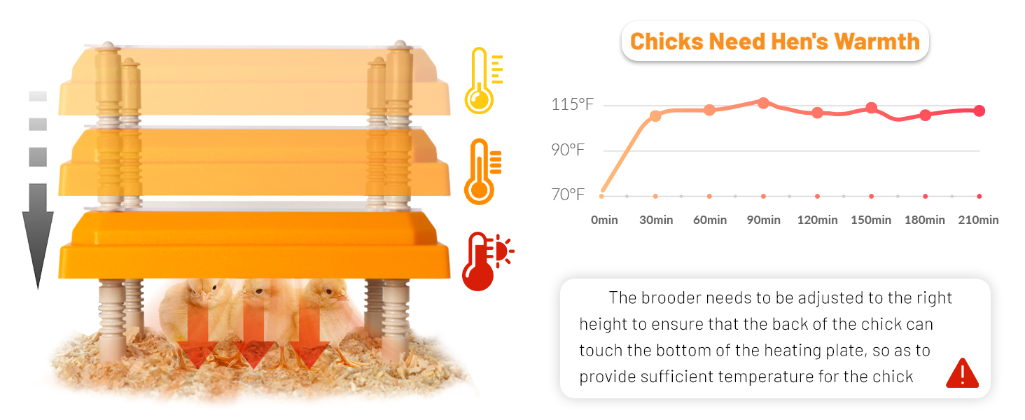 This brooder is able to keep your chicks warm. The brooder heater can provide enough warmth for up to 15 chicks, and the temperature can reach about 115℉ after one hour. The aluminum plate at the bottom can keep the temperature more constant, creating a perfect environment for chicks