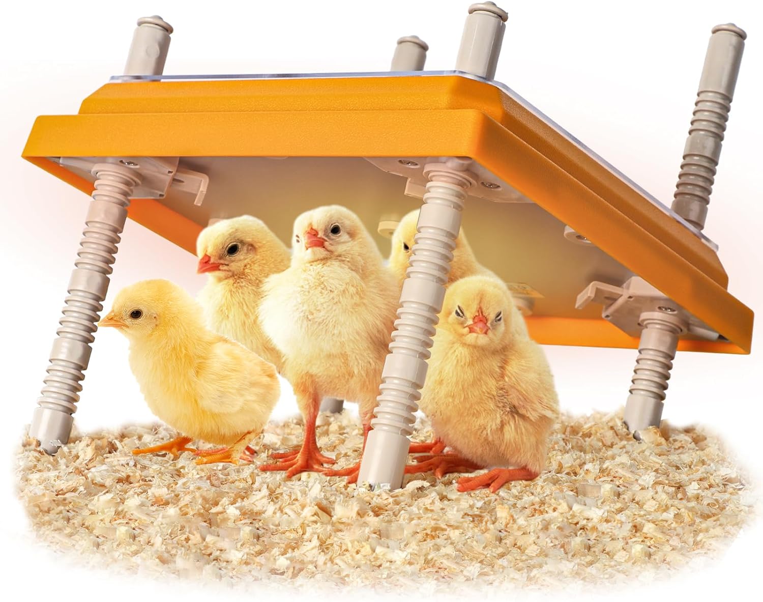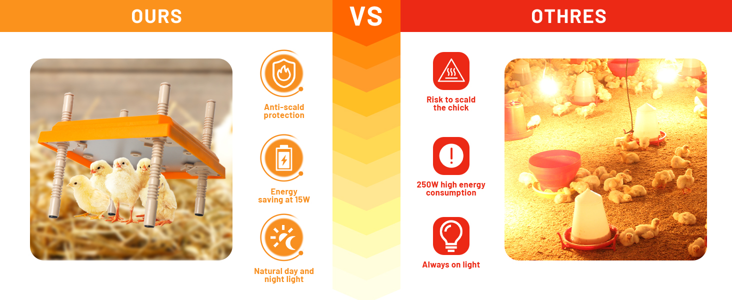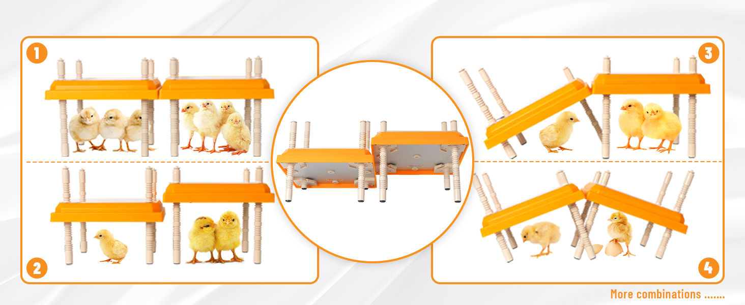 Height and Angle: Our brooder has a unique snap and leg design, which allows the heating plate to present different heights and angles to meet the needs of chicks of different sizes