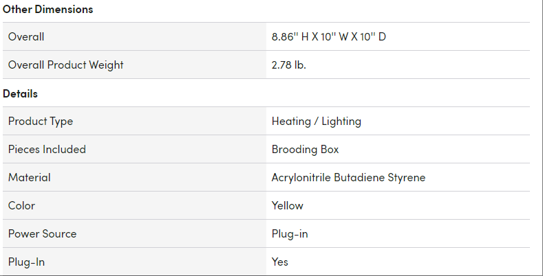 Safe and Energy-saving: When the heating lamp is up to 250 watts, the brooder consumes only 15 watts/hour. It consumes less energy and saves money. The shell is made of flame-retardant material to reduce the risk of burns and fire. Two safety features, a 10 amp resistance fuse and a 120°C/250°F temperature fuse