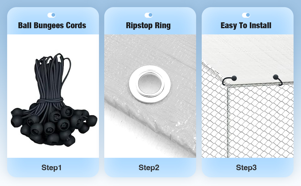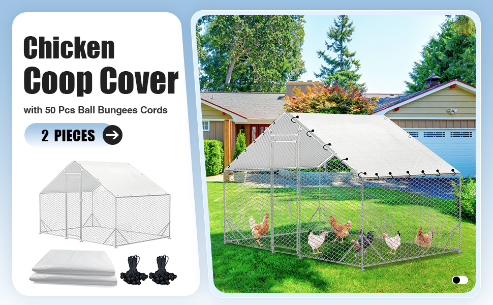 2 x Chicken Coop Covers, 70 x Ball Bungees Cords, 1 x Metal Frame, 6 x Netting