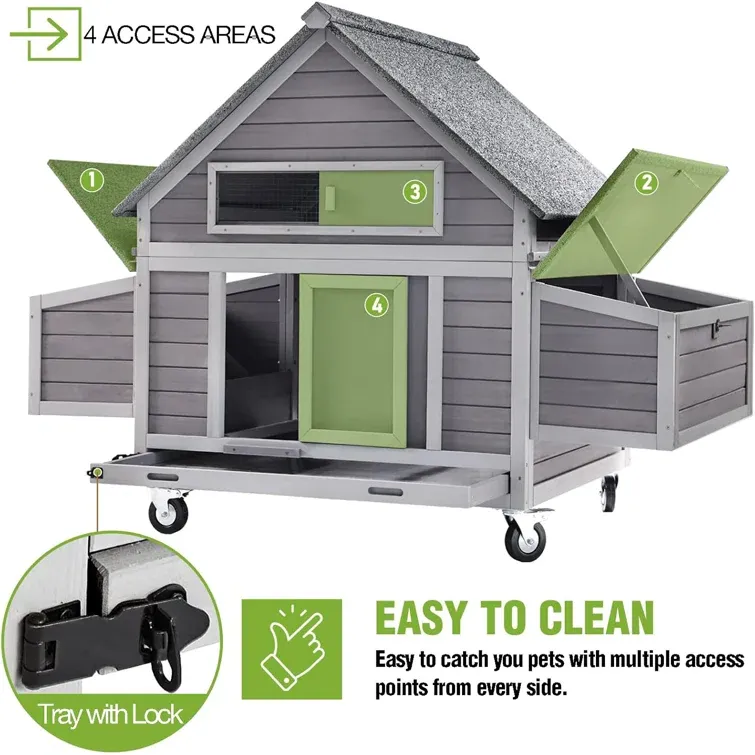 Quick Cleaning: Build with four access points and a removable sliding tray allow hassle-free maintenance the chicken house