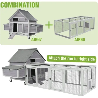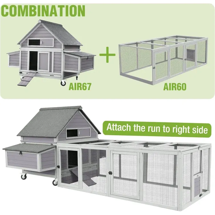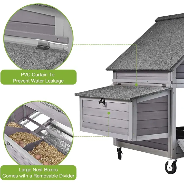 Upgraded Chicken Haven! 4-wheel design for effortless moving + fresh grazing. Spacious 6-section nesting boxes w/ easy-open roof. Quick-clean access points & removable tray. Solid wood + predator-proof locks. Roomy 19 ft² fits 3-6 hens; expand with optional run (68”Lx41”W). Happy hens, stress-free care!