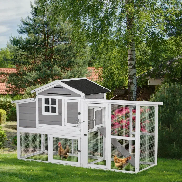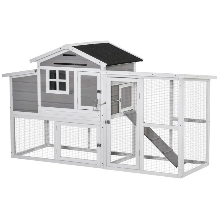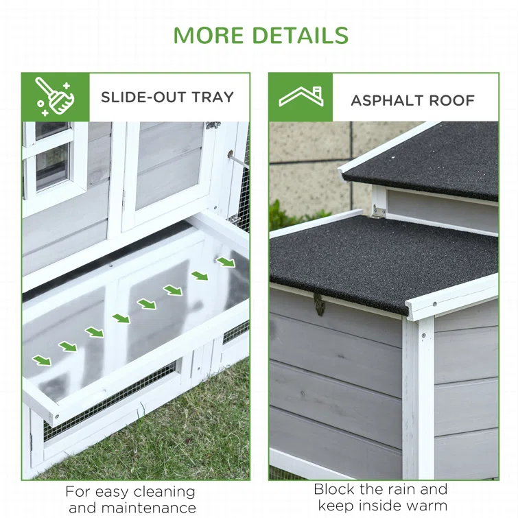 Give your chickens a cozy new home with this Plenty of Space chicken coop. This spacious cage includes the main house and a large run for them to rest and move around with a ramp that connects the room and run. The leading houses are elevated to keep them away from moisture. The tray is removable for easy cleaning. This coop is constructed of fir wood with water-resistant based paint to resist different light outdoor weather. Let PawHut help keep your chickens happy and comfortable.- Asphalt roof blocks the rain and keep warm- Separate nesting box for multiple chickens- A stand rail for them to rest- Three doors allow you to reach inside- Removable tray for easy cleaning- Mesh window for air circulation- Made of durable fir wood with water-resistant paint- Assembly required- Colour: Grey, Black, White- Material:
